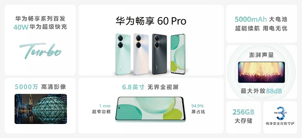 華為暢享60 Pro配備一塊6.8英寸的影音大屏,邊框窄至1mm,屏占比達(dá)到94.9%,是華為最高屏占比直屏手機(jī);手機(jī)峰值音量達(dá)到88dB,引領(lǐng)大音量的聆聽潮流;此外,在256GB超大存儲(chǔ)加持下,用戶輕松實(shí)現(xiàn)手機(jī)存儲(chǔ)自由。