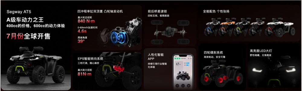 這款被譽為“A級車動力王”的 Segway AT5 全地形車,在發(fā)布會上大放異彩。它擁有強勁的動力和卓越的配置,600cc的動力搭配400cc的售價,為駕車者帶來了更加震撼的越野感和更具心動的價格。Segway AT5 采用的是全自主研發(fā)的四沖程單缸雙頂置凸輪軸發(fā)動機,其最 高速度為100km/h,最 大車輪轉(zhuǎn)矩為840N·m,0-60km/h的加速時間只需要4. 6 秒,這樣強勁的動力性能使得它的駕駛員能夠在任何復(fù)雜的地形中暢通無阻。