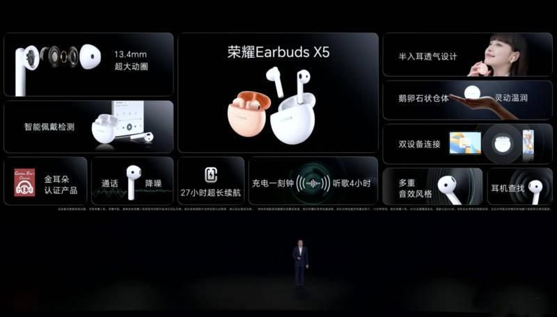 發(fā)布會上,榮耀還帶了一款Earbuds X5耳機(jī)新品,采用了鵝卵石狀倉體,提供釉白色和珊瑚粉兩款配色。耳機(jī)采用了半入耳設(shè)計(jì),單只僅重3.8g,帶來空氣感舒適佩戴體驗(yàn)。Earbuds X5采用了13.4mm動圈單元,復(fù)合鍍鈦振膜,呈現(xiàn)純正音質(zhì),并通過金耳朵產(chǎn)品認(rèn)證。Earbuds X5提供了27小時超長續(xù)航,充電一刻鐘,可以支持4小時聽歌體驗(yàn)。
